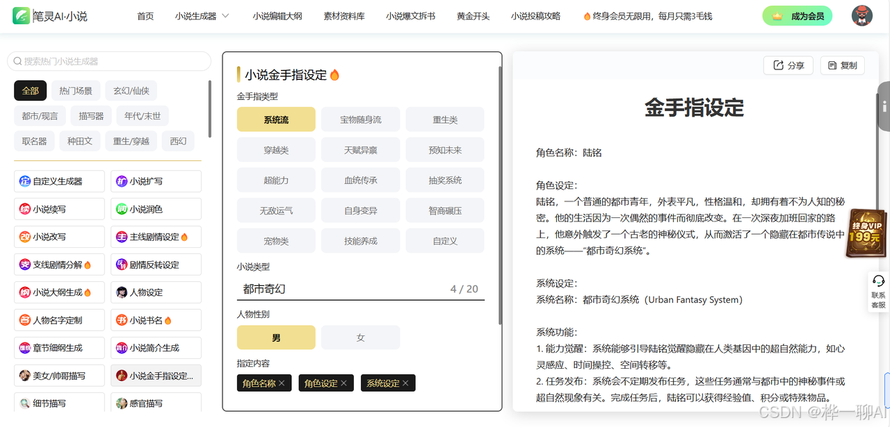 有了思路还是不清楚怎么具体运用到自己的写作中?【笔灵AI小说】中的【小说金手指设定】智能生成器可以帮助完善具体情节元素。