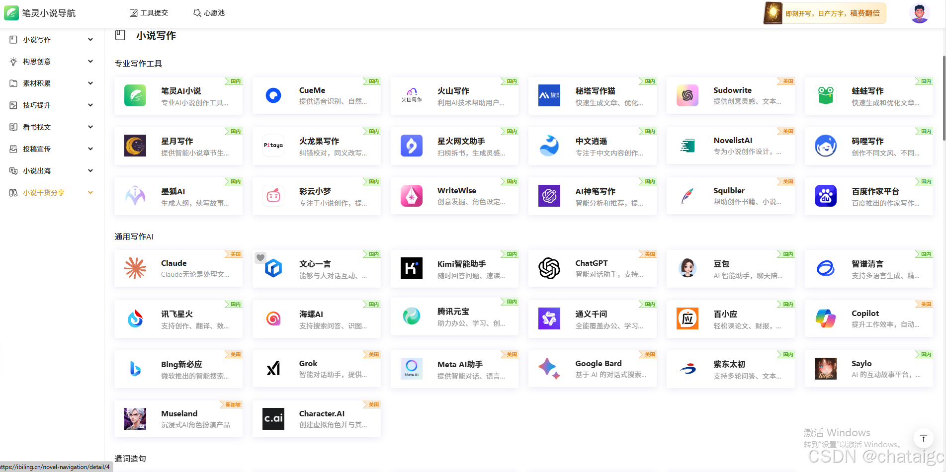 近期笔灵AI写小说上线了【小说导航站】新功能,国内外全平台写小说工具应有尽有,从素材灵感积累到写作技巧的提升再到小说投稿出版出海攻略,只在笔灵AI一网打尽!