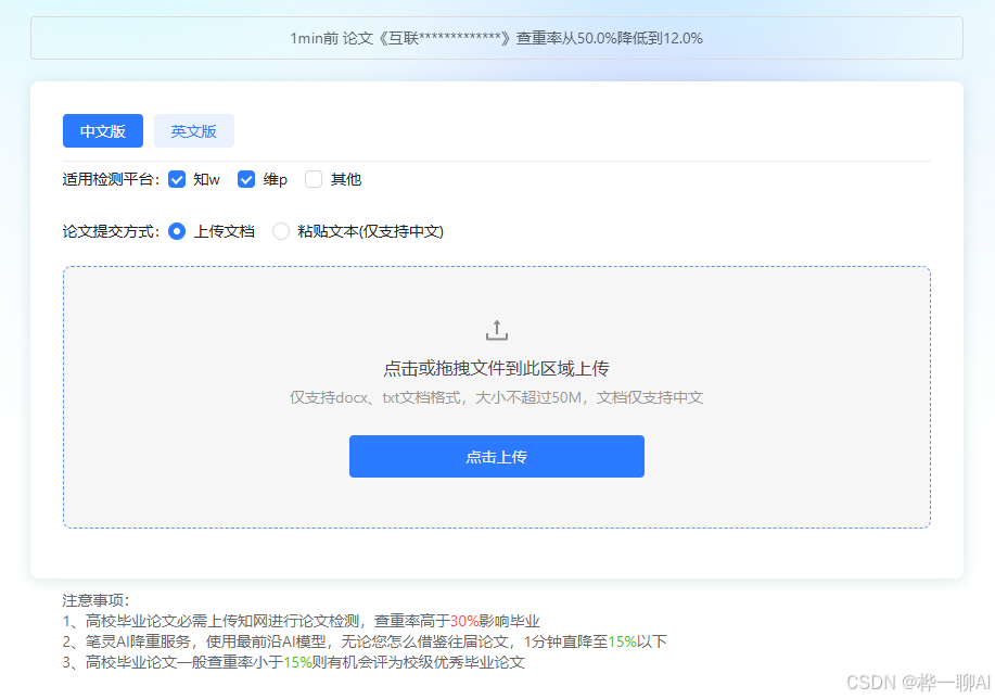 进入笔灵AI“文章降重”页面(https://ibiling.cn/jiangchong?from=csdnmanjpaper),选择中文版或英文版和0适用的检测平台,然后上传论文的文档,或把想要被降重的部分粘进文本框中。等待一分钟,就可以得到查重率低于15%的文章啦。另外值得一提的是笔灵AI采用阿里云安全储存,加密传输,不会泄漏任何论文信息,方便又安心!