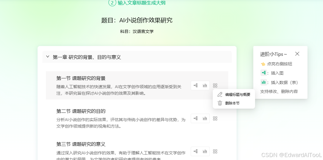 此外,笔灵支持在页面上对大纲进行手动修改编辑,如删除某些章节、修改标题和概要、标记哪些章节需要插入图和数据表,因此以笔灵生成的大纲为基础来调节确定自己的大纲也是非常方便的哦。