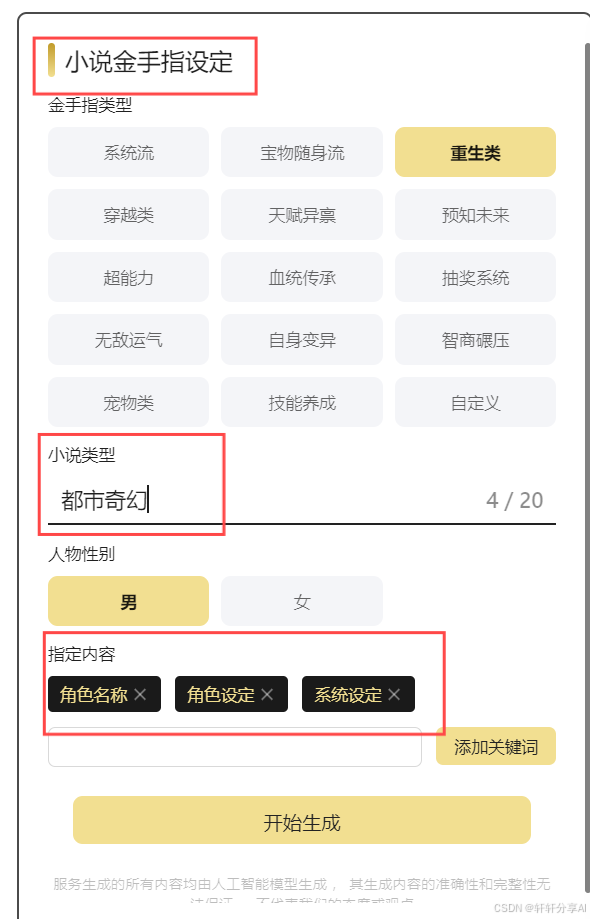 第一步:选择小说金手指设定 第二步:选择金手指类型、小说类型和人物性别,根据需求适当补充指定内容 第三步:生成金手指设定 |