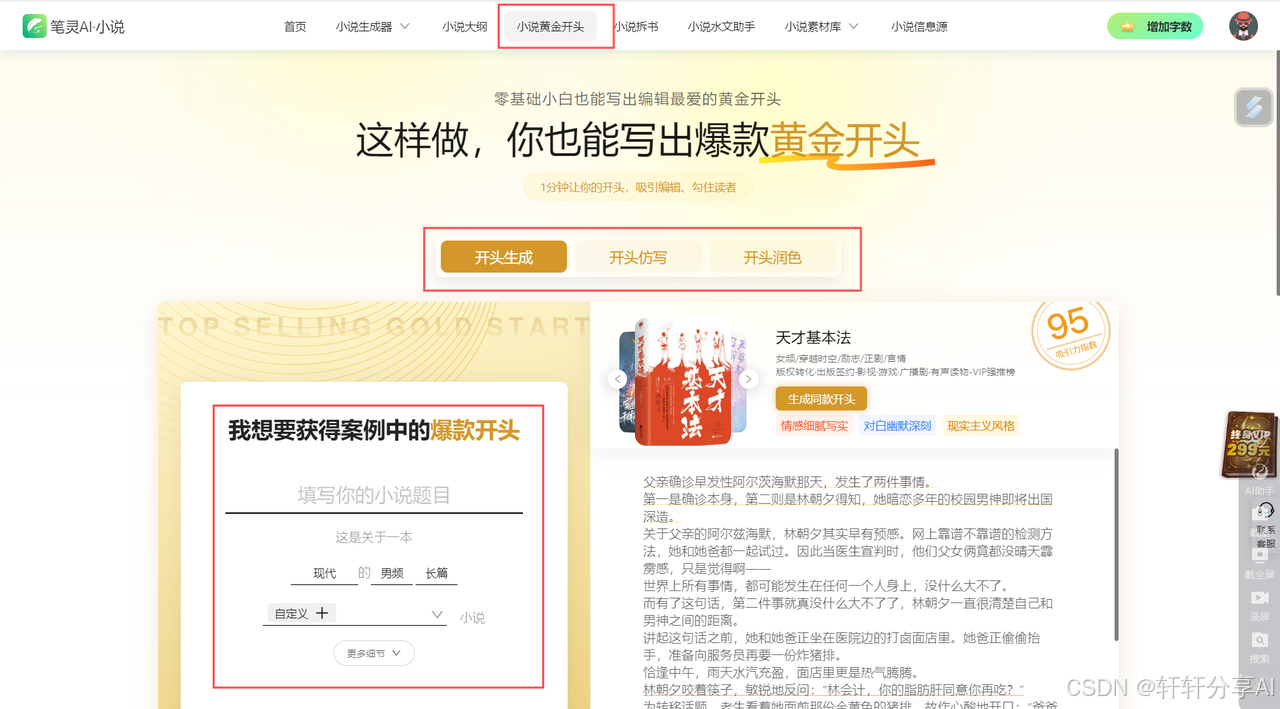 打开小说黄金开头的页面,可以看到爆款开头的生成器,添加小说的小说标签等。