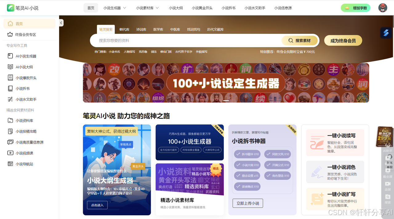 笔灵 AI 小说是笔灵旗下的小说平台,助力网文写作,提升写作效率!汇集短篇小说一键生成、爆款小说拆解、编辑大纲一键生成、200+小说生成器、总结网文大神写作公式、精选小说资料库。让小白也能快速上手成为网文大神。笔灵AI小说的功能以PC网页为主,体验更佳。笔灵AI小说提供的主要功能有200+小说AI生成器、小说爆文拆书、小说编辑大纲、海量素材资料库、黄金开头等,本文主要涉及小说编辑大纲、黄金开头和小