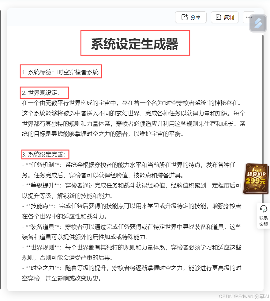基于第一部分的系统设定生成器生成内容,将生成的世界观设定作为要求输入,可以看到生成的内容比较完善。