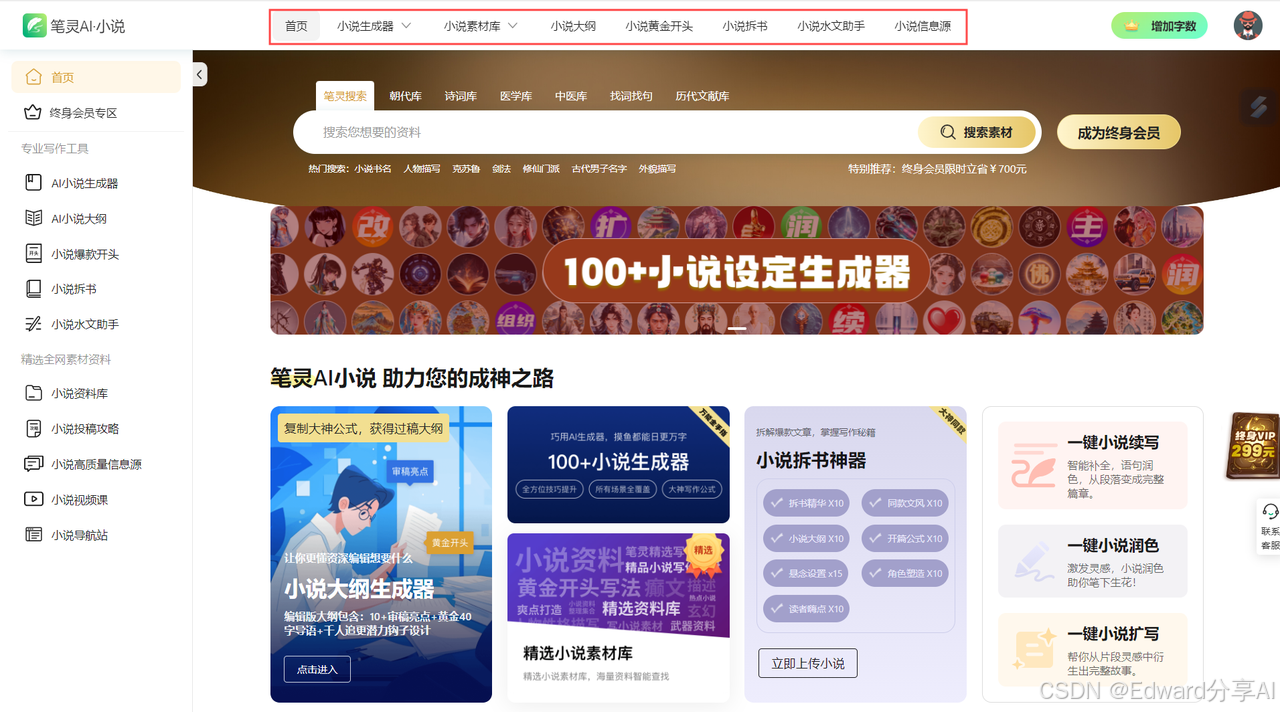 汇集爆款小说拆解、小说大纲一键生成、200+小说生成器、总结网文大神写作公式、精选小说资料库。