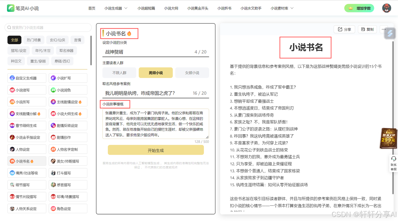 想要小说的书名更有吸引力?笔灵AI小说拥有200+小说生成器,可以应对男频女频各种类型,帮助你无痛写出优秀大纲细纲,润色剧情,更好塑造人物,建立庞大而有逻辑的世界观,一键取出高大上的名字,也可个性化创造。(传送门:https://ibiling.cn/novel-workbench/?from=csdnhynovel)