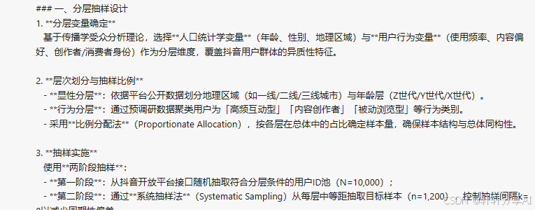 输入:"用传播学量化研究方法术语,描述对抖音用户进行分层抽样调查的过程,要求包含信效度检验说明"