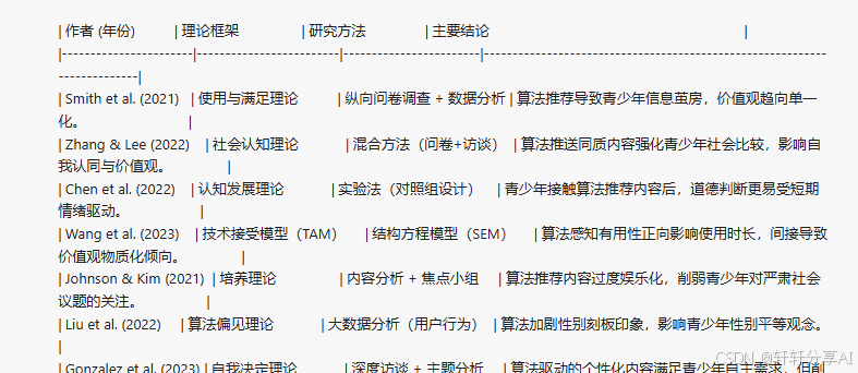 "列出近三年SSCI期刊中关于短视频平台算法推荐机制对青少年价值观影响的10篇核心研究,用表格呈现作者、理论框架、研究方法、主要结论"