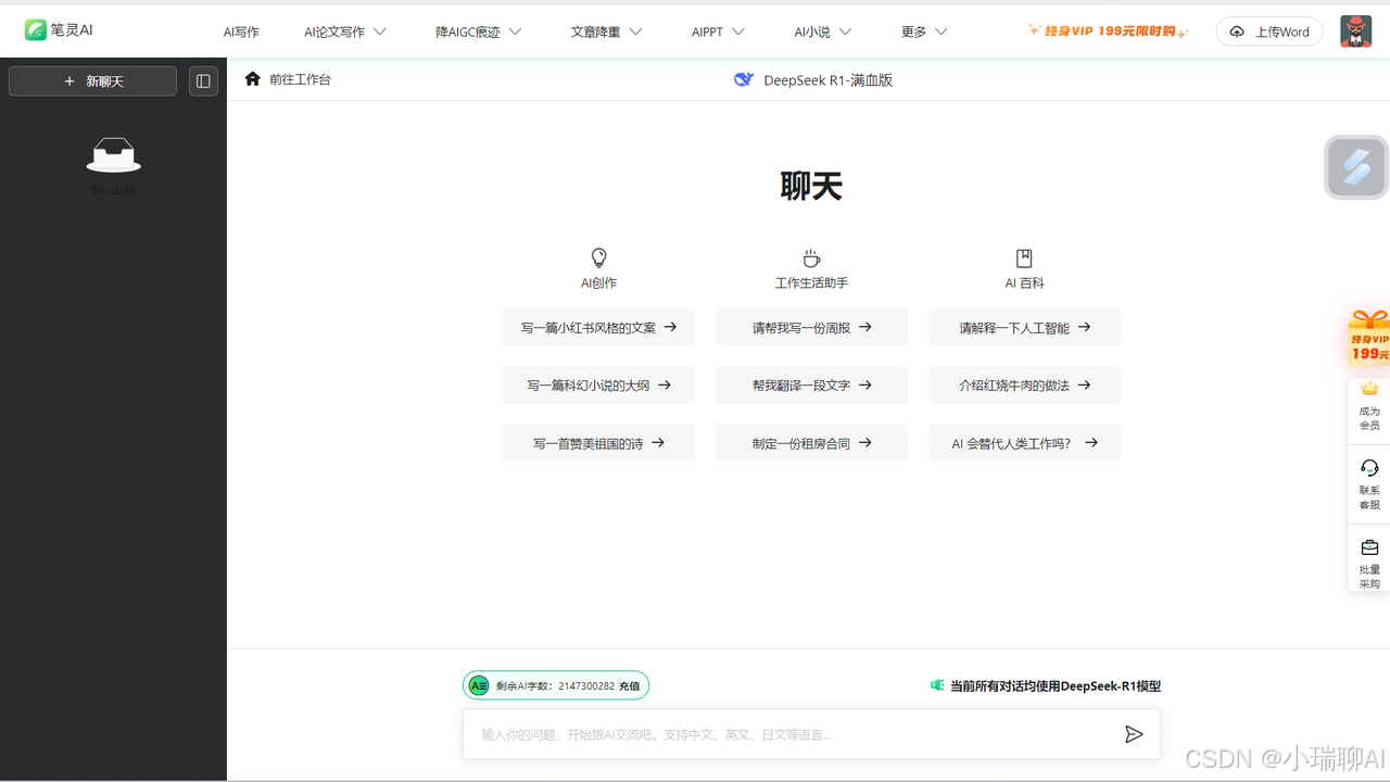 最后推荐我们的笔灵AI,笔灵AI已成功整合DeepSeek R1满血版,提供了稳定且流畅的服务体验。由于笔灵AI的服务器尚未被大量用户冲击,可以避免DeepSeek常见的卡顿和服务器繁忙问题。除此之外,笔灵AI整合了DeepSeek的强大功能,提供了AI创作、工作生活助手及AI百科等多元化服务,几乎囊括了各类需求,能够满足用户在不同场景下的使用需求。