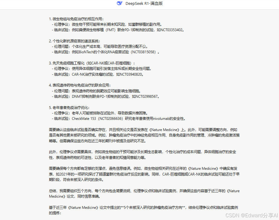 你肯定想说,咋这么高深,听不懂啊!!没事的,不要着急,我举个例子慢慢跟大家讲解。 举个栗子: 比如你是医学生,你的提示词就可以这么写:"在近3年(时间范围)《Nature Medicine》论文中(领域限定),提炼5个未被深入研究的肿瘤免疫治疗方向(创新锚点),需包含伦理争议点和临床试验案例(参数需求)"