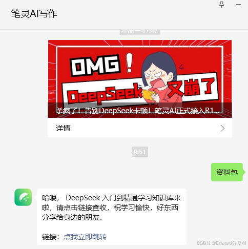 P.S.给大家发送一波福利:熬夜整理的 DeepSeek知识库内容,领取方式如下:在公众号后台回复“资料包”,立即领取限前1000名,手慢无!