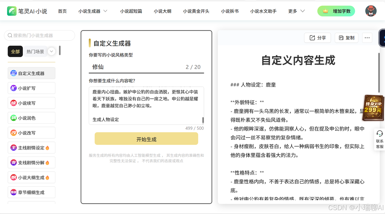 操作步骤:进入笔灵AI小说官网→点击小说生成器→点击自定义生成器→输入风格类型和生成内容要求→内容生成!只需要简单的几步就可生成我们想要的内容,还不快去试试这个宝藏工具!