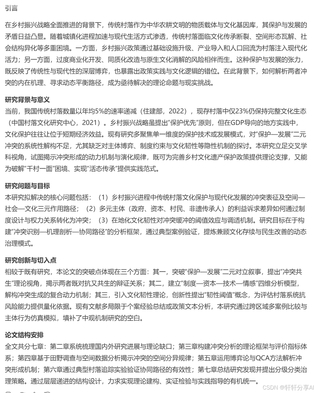同样以乡村振兴背景下传统村落文化保护与现代化发展的冲突机制研究主题为例,DeepSeek生成引言如下: