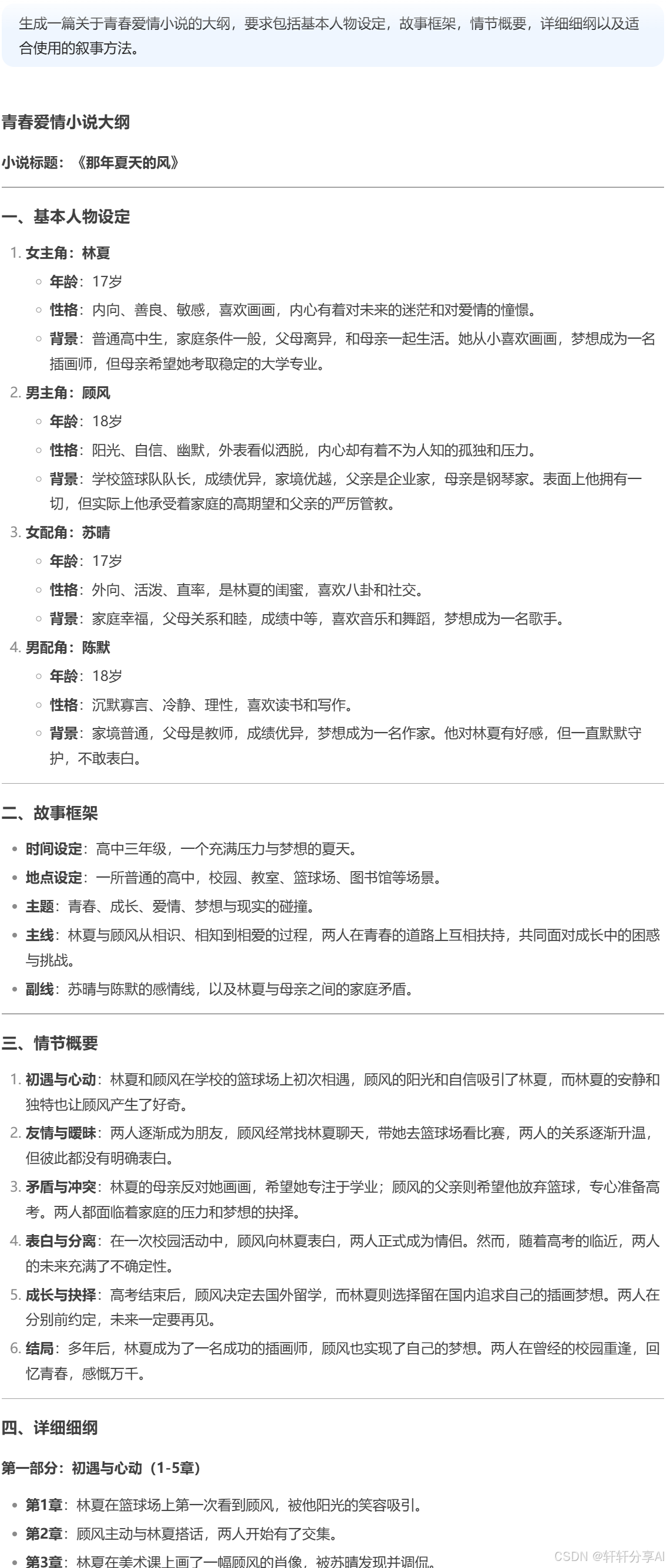 例如:生成一篇关于青春爱情小说的大纲,要求包括基本人物设定,故事框架,情节概要,详细细纲以及适合使用的叙事方法。