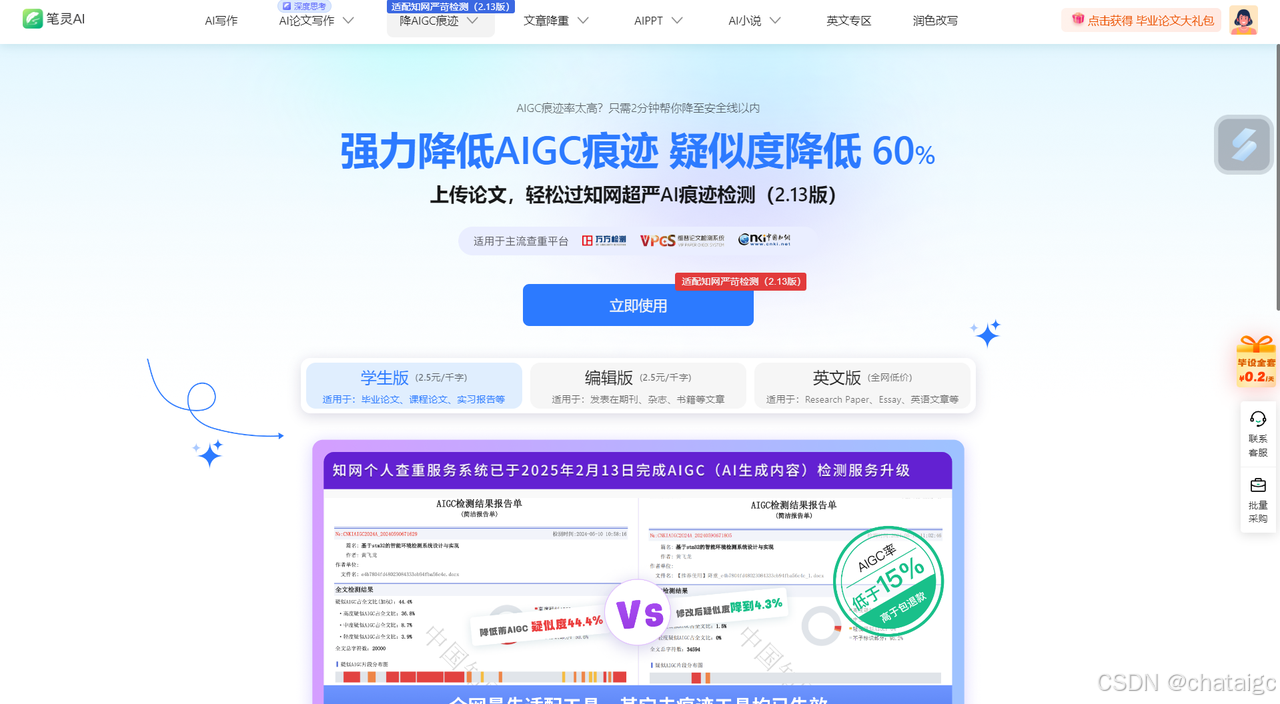 想要一键降低AIGC?那就去使用AI工具辅助,比如笔灵AI,只需要简单的三步即可完成。笔灵AI的论文降AIGC痕迹功能针对新版检测系统进行了服务升级优化,现在是适配知网严苛检测的2.13版!