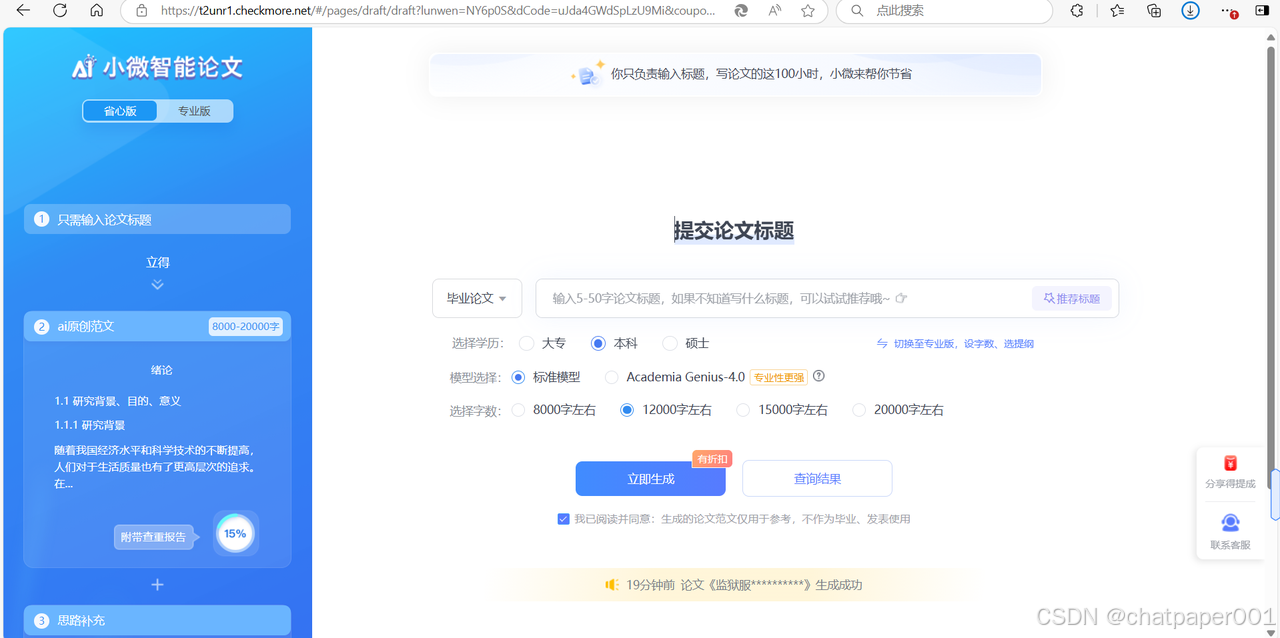 操作简单到离谱:输入论文题目,选好专业和学历,点一下“生成大纲”。不到10秒,一份逻辑清晰、结构完整的千字大纲直接甩到你面前。重点是,这大纲不是通用模板!它会根据你的选题定制内容,还能随时在线编辑。比如你研究“短视频对青少年价值观的影响”,它连“算法推荐机制”“社交模仿行为”这些细分方向都能帮你列出来。