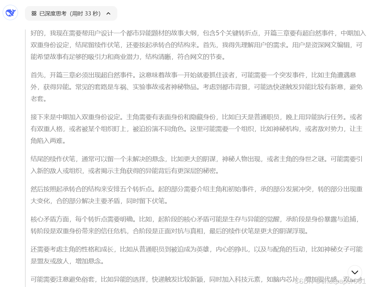 最近知乎上铺天盖地都是“AI取代网文作者”的焦虑帖,有人甚至断言:“DeepSeek一分钟能生成三万字,底层写手再不转行就等着饿死!” 但说句实在话——。这些扎进血肉的人间烟火,才是网文真正的灵魂。今天,我们就来聊聊怎么把DeepSeek变成你的“隐形枪手”,让我们这种没背景的普通人,也能在网文圈杀出条财路!