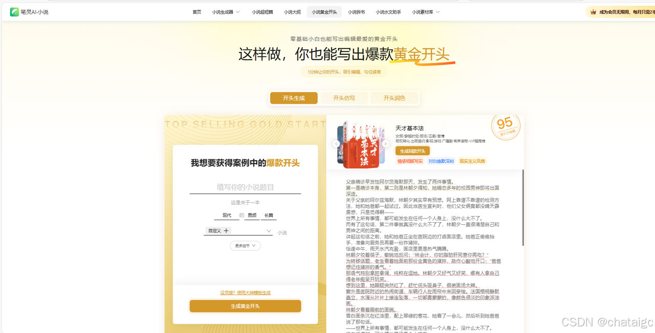 - 借助笔灵AI【小说黄金开头】 在笔灵AI的【小说黄金开头】板块直接输入你的要求,快速就会生成爆款的黄金开头,更便利快捷!