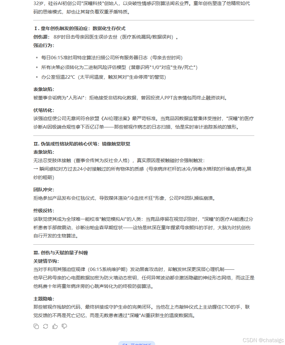 - 进阶指令: 为【创业公司CEO】设计:一个童年创伤导致的强迫症+一个看似缺点实为伏笔的特征 DeepSeek输出: