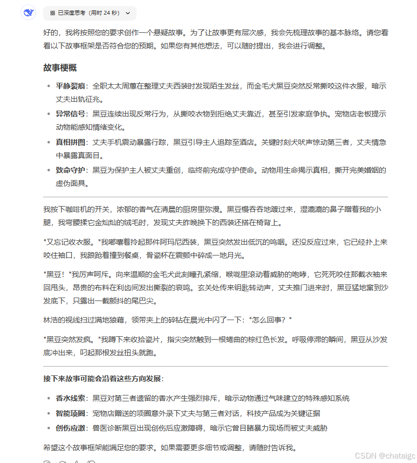 - 示例: 生成古风悬疑开篇:子时三刻(时间),绣娘(职业)在嫁衣袖口发现西域香料(物品),而新娘三天前已溺亡(反常识)
