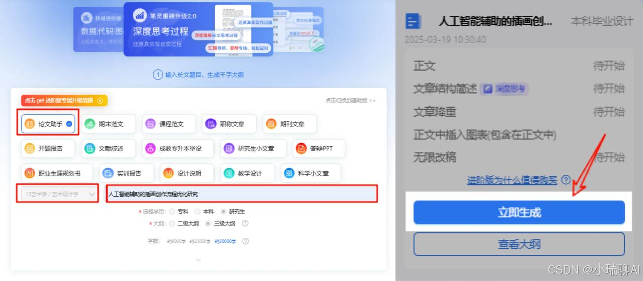1.打开软件选择【毕业论文】、输入论文主题、专业,点击“生成大纲”。