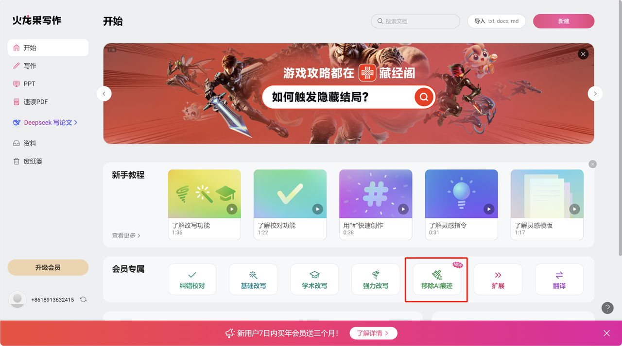 火龙果写作是一款AI驱动的综合性的文字生产工具,有非常丰富的功能,进入网址后需要按照指示注册登入,然后就可以在首页看到“移除AI痕迹”这一板块。