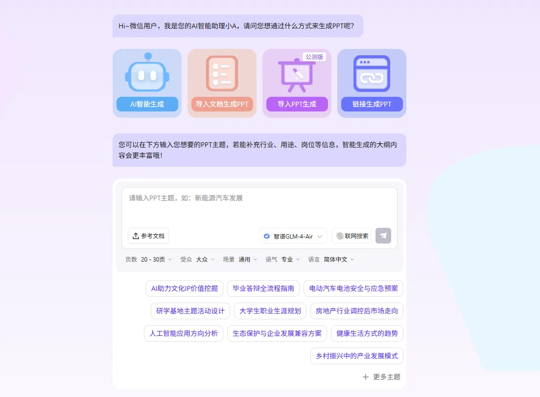 同样也可以进行联网搜索功能,可以选择页数、受众、场景和语气,但是没有很适配学术答辩风格的PPT,不过功能比较丰富,除了答辩还有其他PPT制作需求的就可以试试看这个工具。