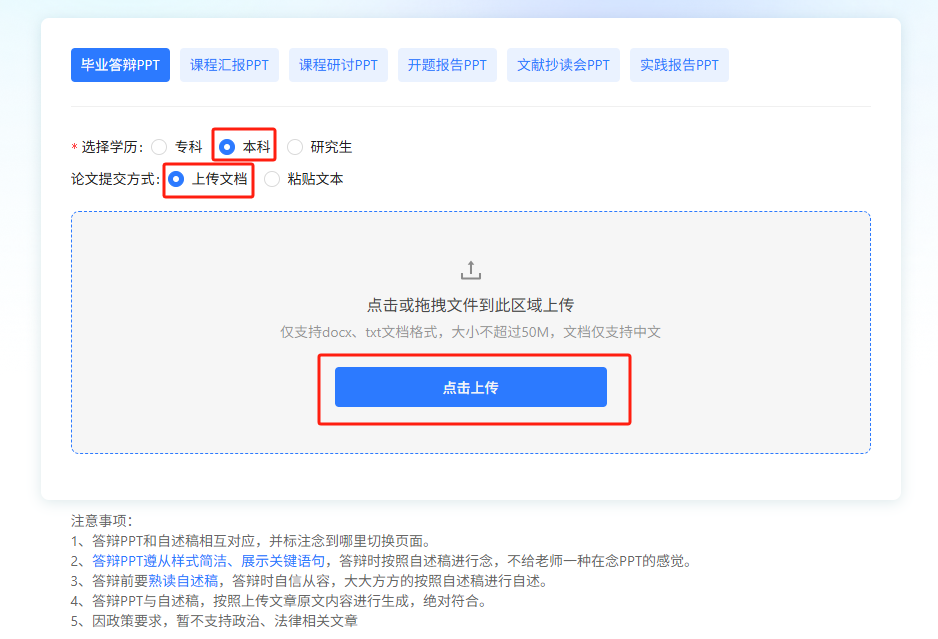 第二步:根据答辩类型选择,毕设直接选择【毕业答辩PPT】就可以啦,选择学历和提交方式,笔灵支持【上传文档】和【粘贴文本】两种形式,然后上传你的论文文档,docx和txt文档格式都可以哦~