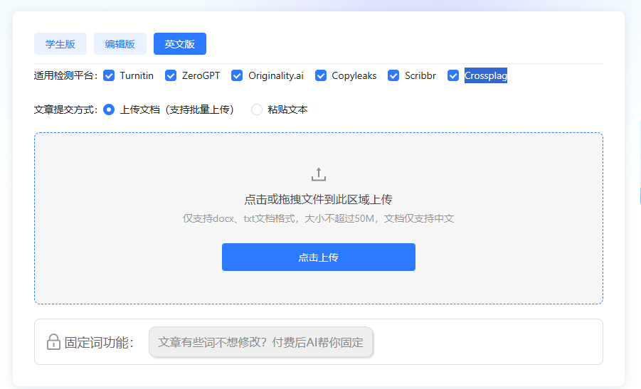 首先选择英文版本,再选择需要的适用检测平台,进行提交文章就好,要是需要降整篇文章的话直接传文件就好了,要是只需要降某一段的话,就选择粘贴文本。