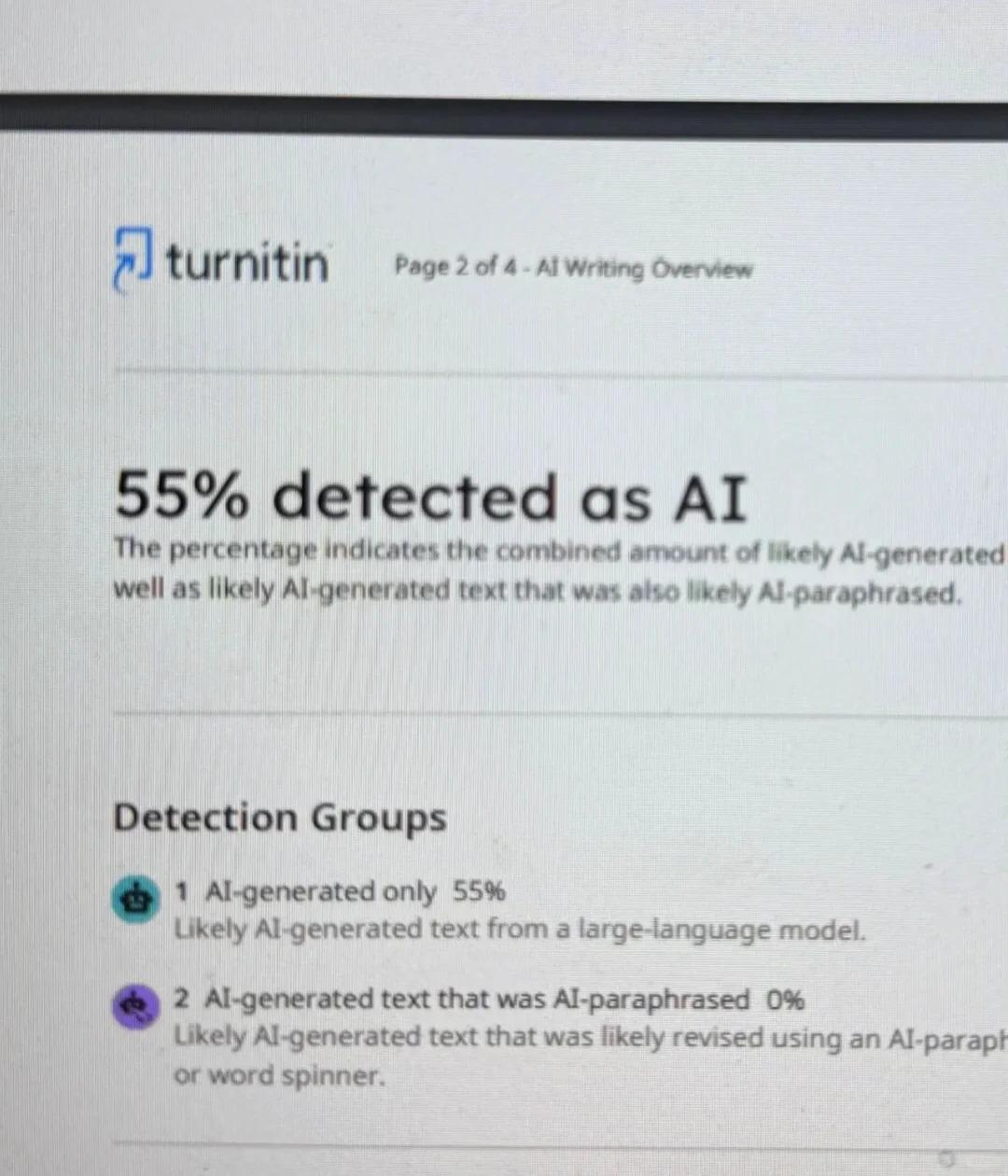 “天啊!我好不容易写完的essay,交给Turnitin检测,结果AI率竟然高达55%!”