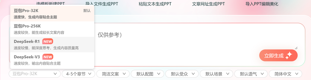 直接在首界面选择,不仅有中文、还有俄文、英文、日语、阿拉伯文,我觉得这个功能对留学生来说,特别的好用,直接帮了你大忙,也不用再去羡慕国内的学生可以用AI制作PPT了。