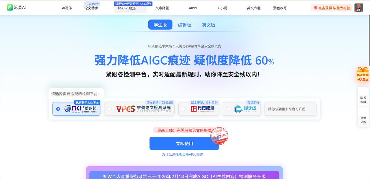 使用笔灵降AI功能十分便捷。用户只需选定适用版本,学生版适用于毕业论文、课程论文等,审稿人/编辑版适用于教育职称论文、期刊论文等;再选择对应检测平台,如知网、维普、万方等主流平台;最后上传文档或粘贴文本,笔灵便能迅速完成检测与降AI操作,最高能直降60% 。