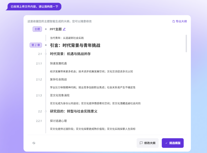 Kimi的PPT助手也很实用。上传文档后,它能自动生成大纲。点击“一键生成PPT”就能得到精美的**答辩ppt**。