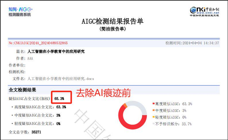 经法学专业学生实践,使用笔灵后,论文中AIGC典型特征从35处锐减至8处,AIGC率从65.3%大幅降至14.3%!顺利通过了学校的AIGC检测系统~