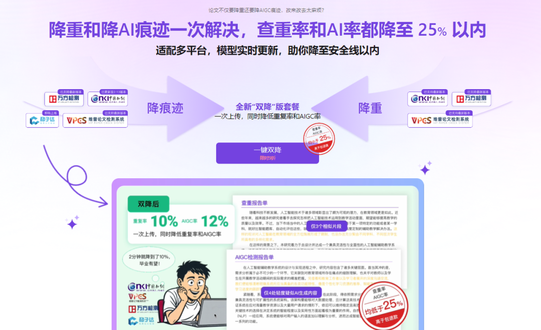 在学术审核日益严苛的今天,论文重复率超标与AI写作痕迹暴露,已成为压在万千学子心头的两座大山。当知网、维普等检测系统不断升级,学校对AI论文的审查愈发严格,无数写作者陷入“改完重复率,AI痕迹明显;消除AI痕迹,重复率反弹”的死循环。难道面对论文“雷区”,只能束手无策?别担心!一款能实现“一键双降”的神器横空出世,无需繁琐操作,无需反复试错,轻松帮你KO重复率与AI痕迹,让论文顺利通过审核,开启学术通关的绿色通道!