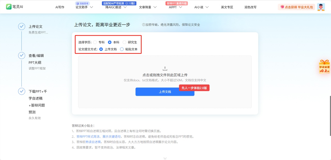 选学历→传论文→点生成。全程不用注册登录,更不用费脑子写提示词。举个例子,我传了5万字的硕士论文,3分钟出20页PPT。页面干净得像苹果官网,强迫症都被治愈了。