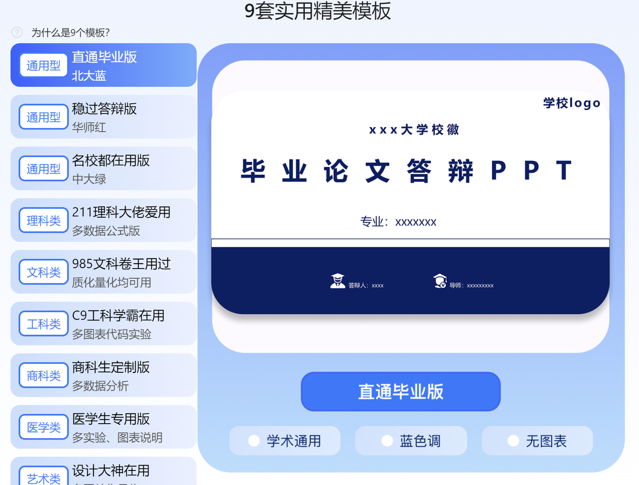 功能二:学科专属PPT模板 笔灵AI提供9套毕业答辩ppt模板,3套通用型,6套按学科定制。比如文科注重文字排版,工科强调图表对比,医学类预留大量数据图位置。所有模板风格简洁,配色低调,完全符合ppt答辩的学术要求。话说回来,千万别选那些带动画特效的模板,老师真的会皱眉!