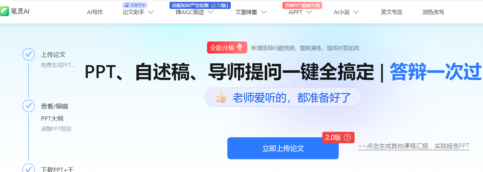 这个功能绝了!上传论文后,AI会从**答辩ppt怎么做**的底层逻辑出发,生成针对性自述话术和应答策略。上次隔壁组同学被问"为什么不用XX方法",全靠预设答案丝滑过关。