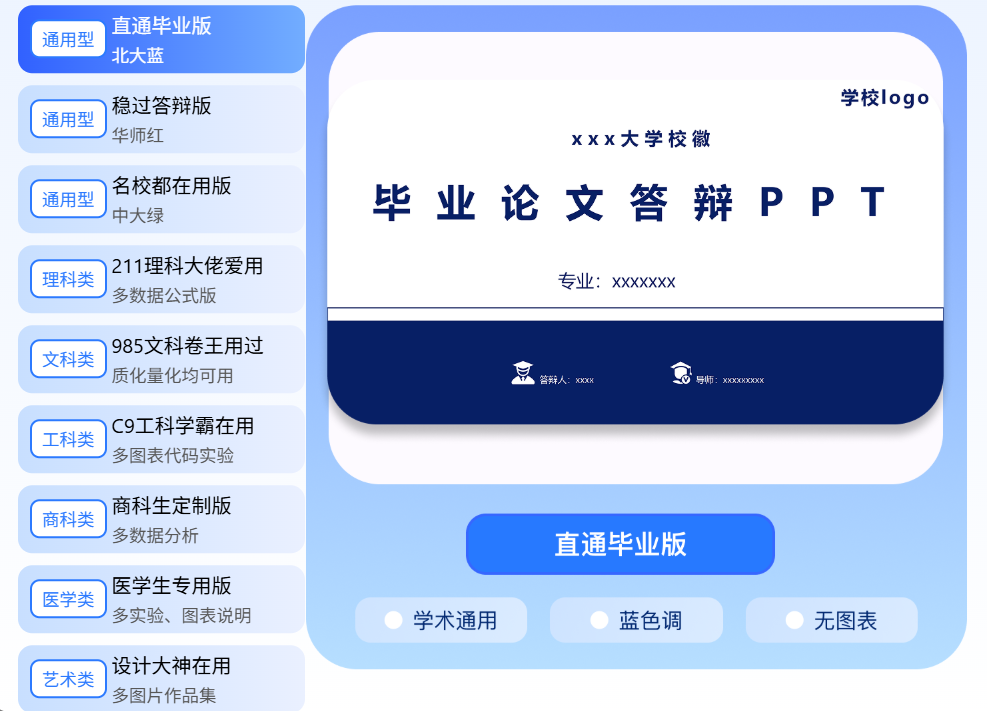 9套模板任选:3套通用模板,6套分专业设计,省心!
