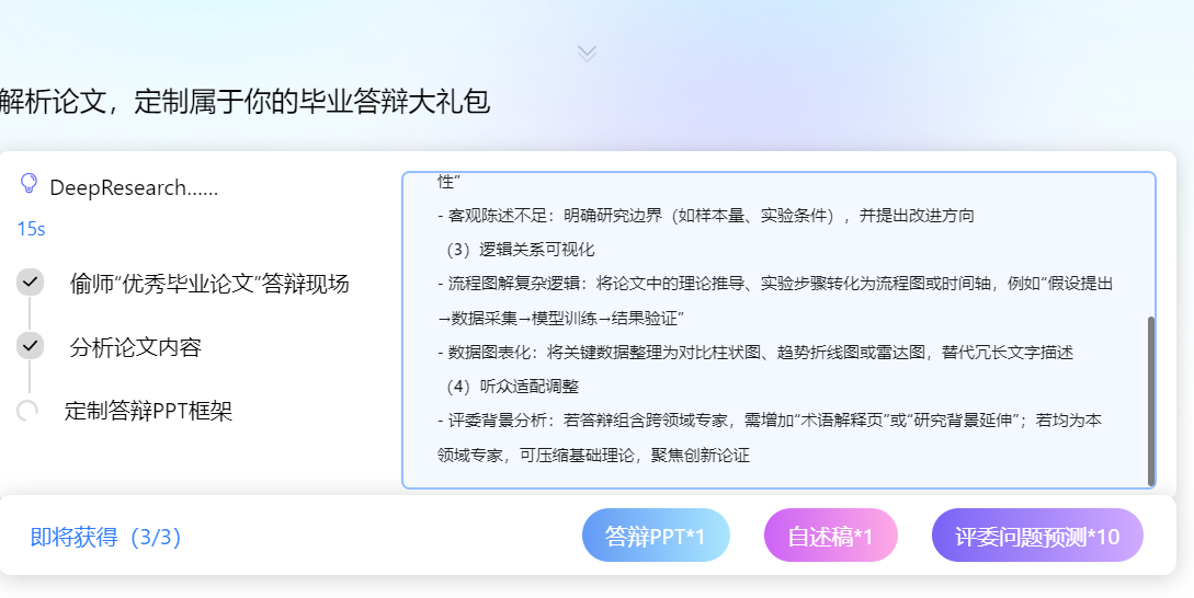 深度解析论文:支持5万字文档一键解析,精准提取研究背景、方法、结论与创新点。自动压缩成20页逻辑严密的**答辩PPT**,数据保留率超95%。