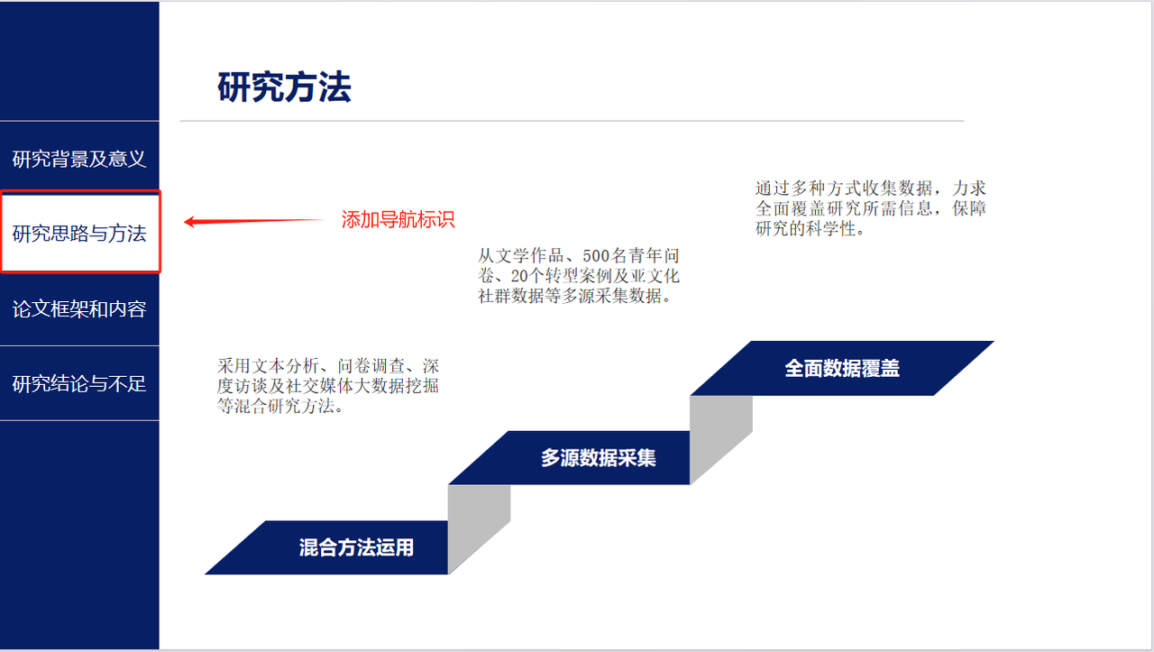 按“思路方法→框架内容→结论不足”展开。**答辩PPT怎么做**?重点突出创新方法!比如实验设计、数据分析模型,别老提“文献调查法”这种基础操作。