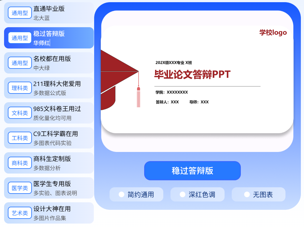 一键生成+专业模板:上传论文选择学历,选个模板,系统自动排版。配色、字体、导航栏全搞定,连学校Logo的位置都帮你留好。
