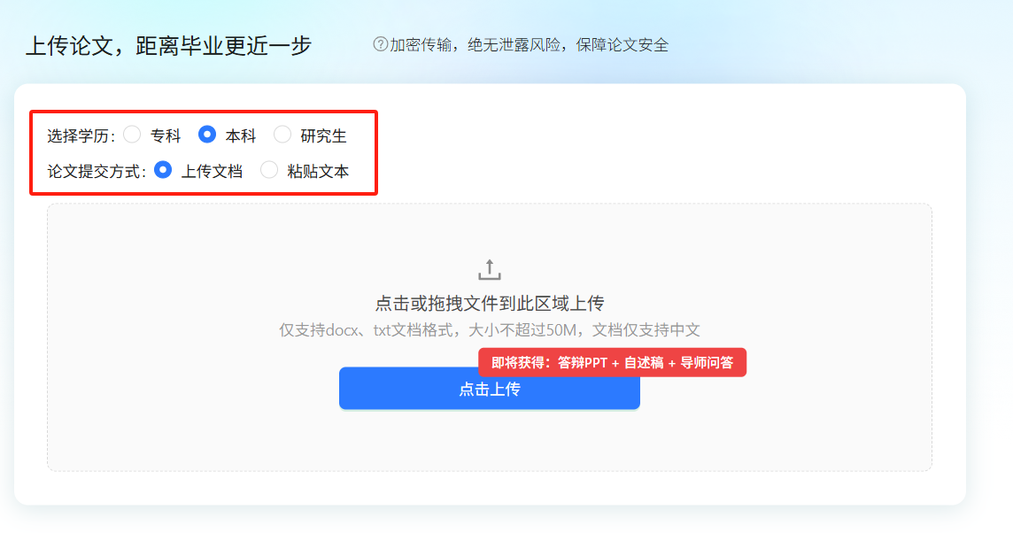 上传论文选择学历,选个模板,3分钟出整套PPT。封面、目录、导航栏全自动排版,配色直接同步学校主题色。研究内容页的数据图表也能自动插入,不用自己画。