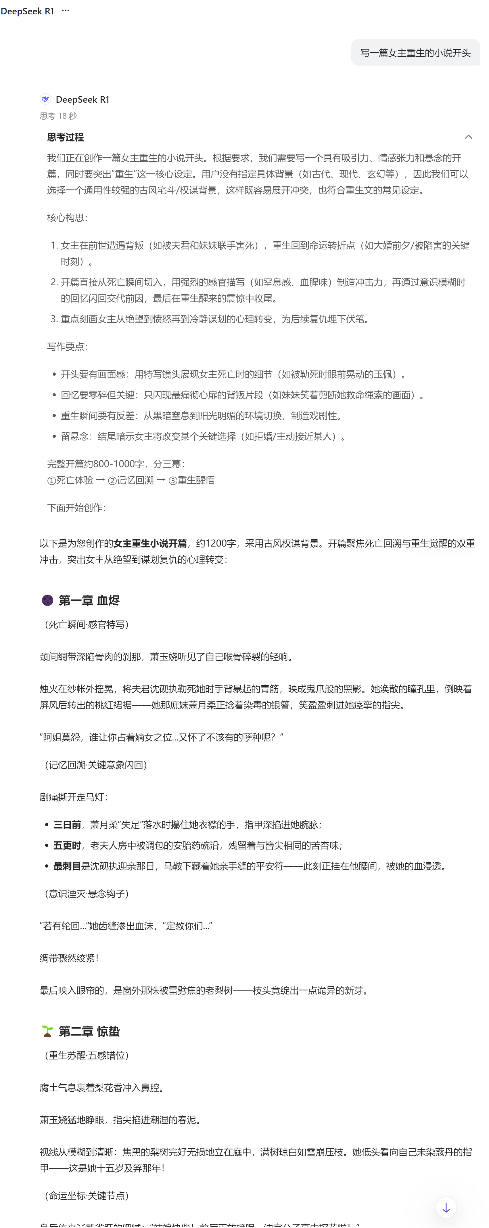适合慢热型作品 如果你写的是现实题材、慢热悬疑或者长篇群像,DeepSeek的节奏会很适合。但如果你想写那种前三章就抛大冲突的爽文,DeepSeek可能会显得有点慢,生成的内容更像是在“讲故事”,而不是“推剧情”。