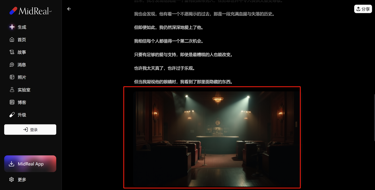 生成内容参与感强 MidReal AI的另一个特点是,它的生成过程非常有互动性。每次生成一段内容后,你可以调整故事的走向,选择系统提供的几个选项,或者自己重新设定剧情方向。这个功能对喜欢掌控故事细节的作者来说非常友好。
