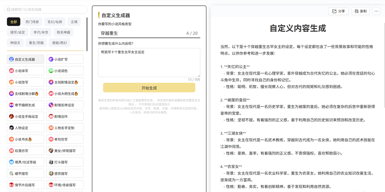 朋友推荐时说它能"拆解小说结构",我还不信。试了重生言情题材后改观了——3分钟生成的情节里,女主和反派的冲突居然自带戏剧张力。