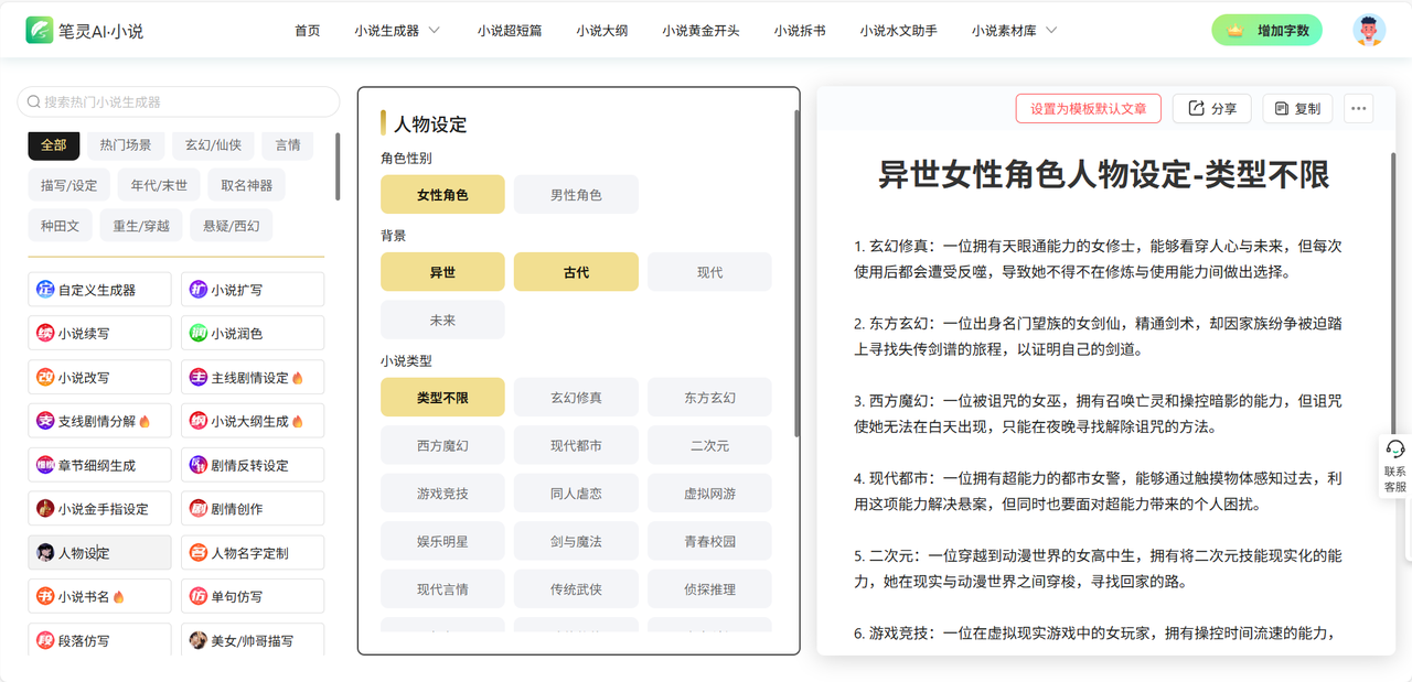 有次卡文卡到崩溃,用笔灵AI的「小说生成器」试了关键词“穿越+职场复仇”,生成的开篇场景直接让我起鸡皮疙瘩:女主在会议室用前世记忆揭发上司剽窃,结尾留了句“您偷我方案时,没发现第7页有您夫人的唇印吗?”——这种钩子读者根本逃不掉。