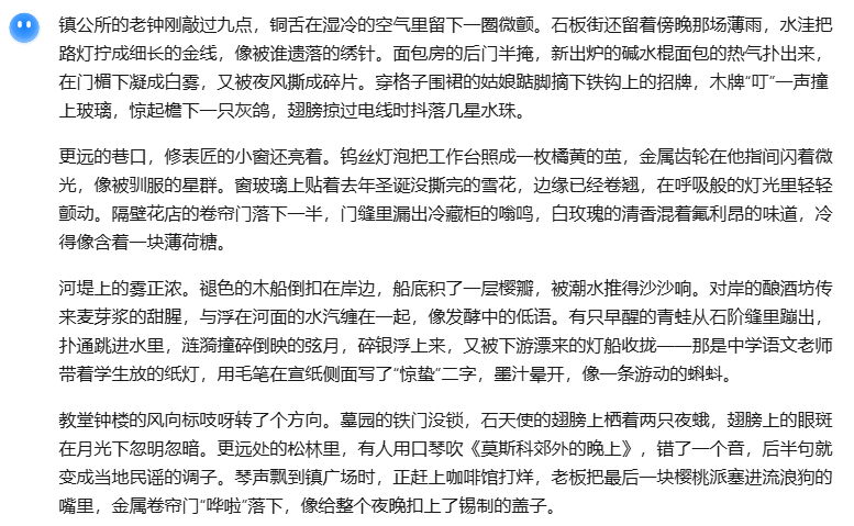 有次写初春小镇夜戏时灵感枯竭,用Kimi输入:"初春小镇深夜,潮湿阴冷,要求细节丰富"。生成的内容让我惊讶: