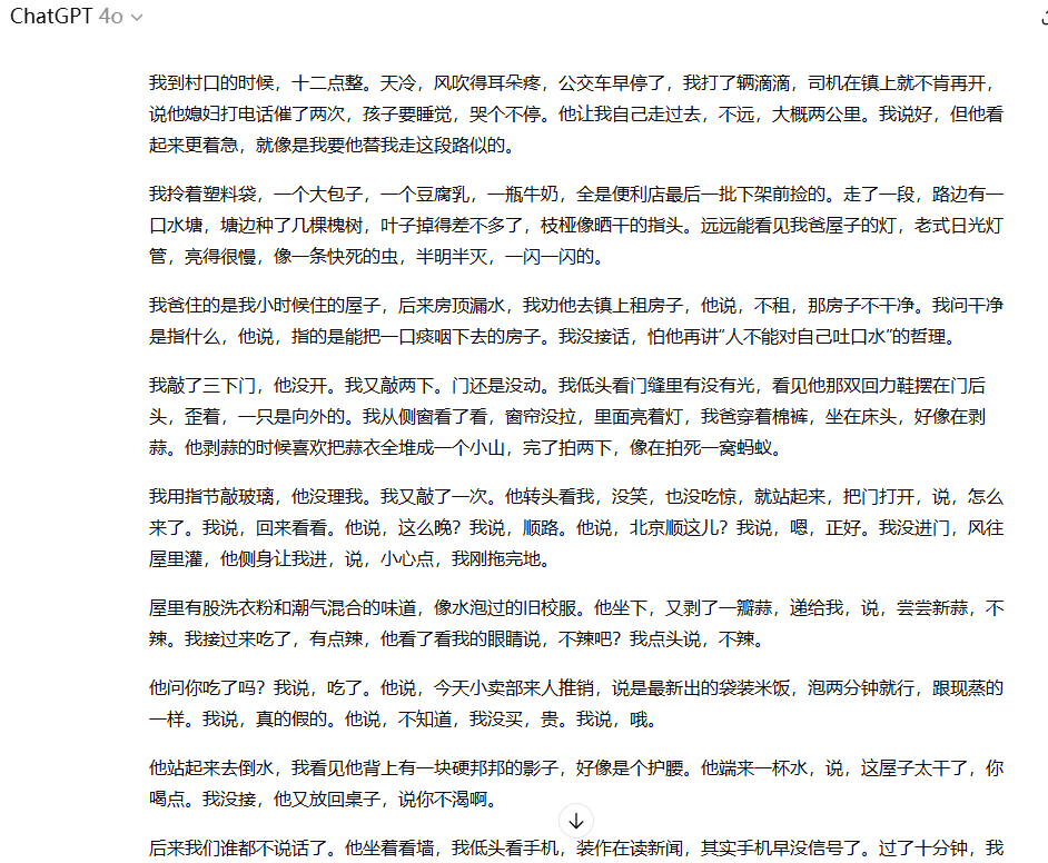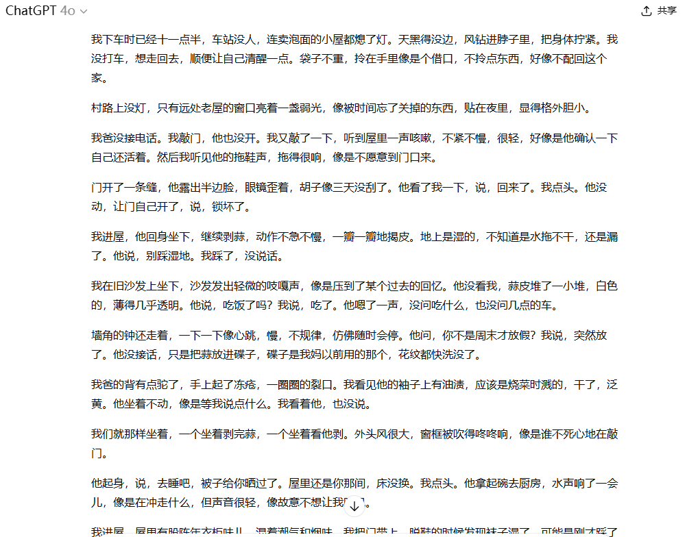 ▶ 工具2:ChatGPT(传送门:openai.com) 需要更精细的指令。想学双雪涛的冷峻感,我输入: “分析‘他踢开积雪,像踢着二十岁的自己’这句的意象组合,仿写中年女人回老家的场景” 生成后我删掉“时光如刀”这类俗喻,保留“她推门惊起麻雀,扑棱声撞得房梁掉下陈年煤灰”的物象隐喻。