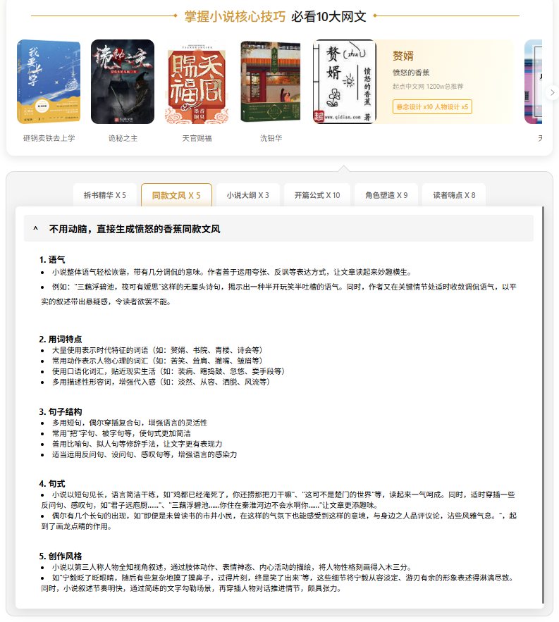 ▶ 工具1:笔灵(传送门:https://ibiling.cn/novel-editor?from=csdneditorgx711) (建议电脑端体验更佳) 它的小说拆书功能是我的心头好。把《活着》片段上传,十分钟就收到分析报告: “福贵视角的悲伤藏在动作里:数铜板时手抖、对老牛说话用短句、回忆家珍时突兀插入天气描写” 照着这个模板,我模仿出下岗工人翻相册的场景:“他手指在玻璃相框上蹭了三次,没擦灰,擦的是水渍。”